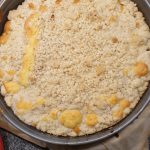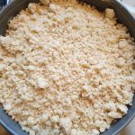 - Die Streusel aus dem Kühlschrank gleichmäßig über den Äpfeln verteilen.